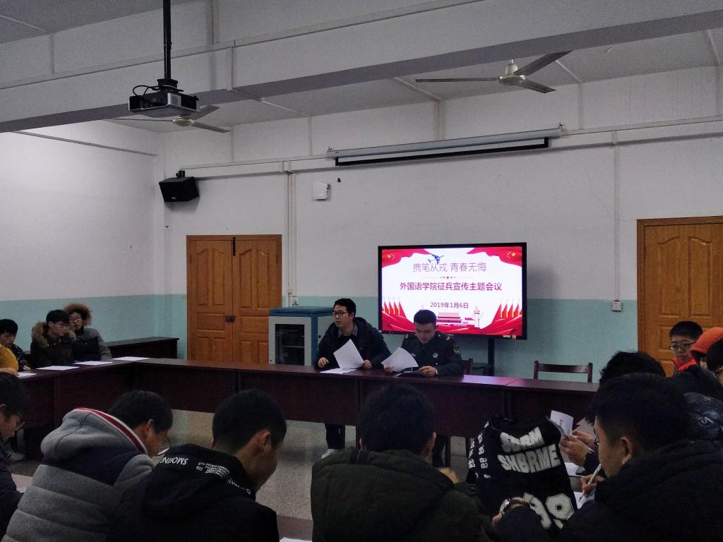 2019年1月6日晚7点,外国语公司老员工征兵宣传主题会议在外院三楼会议室举行,此次大会由辅导员翟诗庆老师主持,并特邀退伍员工冯帅(原14级英语专业)担任主讲人,公司全体男生参加了本次大会。